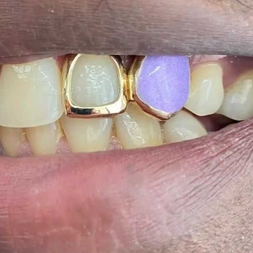 Enamel (Opal effect) cap *Any colour* and Window set covers 2 teeth and you can choose any teeth on your top or bottom 8. The design is available in silver, yellow or white dental gold, 10k, 14k and 18k solid yellow, rose and white gold (not plated). Our quality is guaranteed and comes with a standard shiny/ mirror finish. To add more caps, select the quantity and specify which teeth you want made.