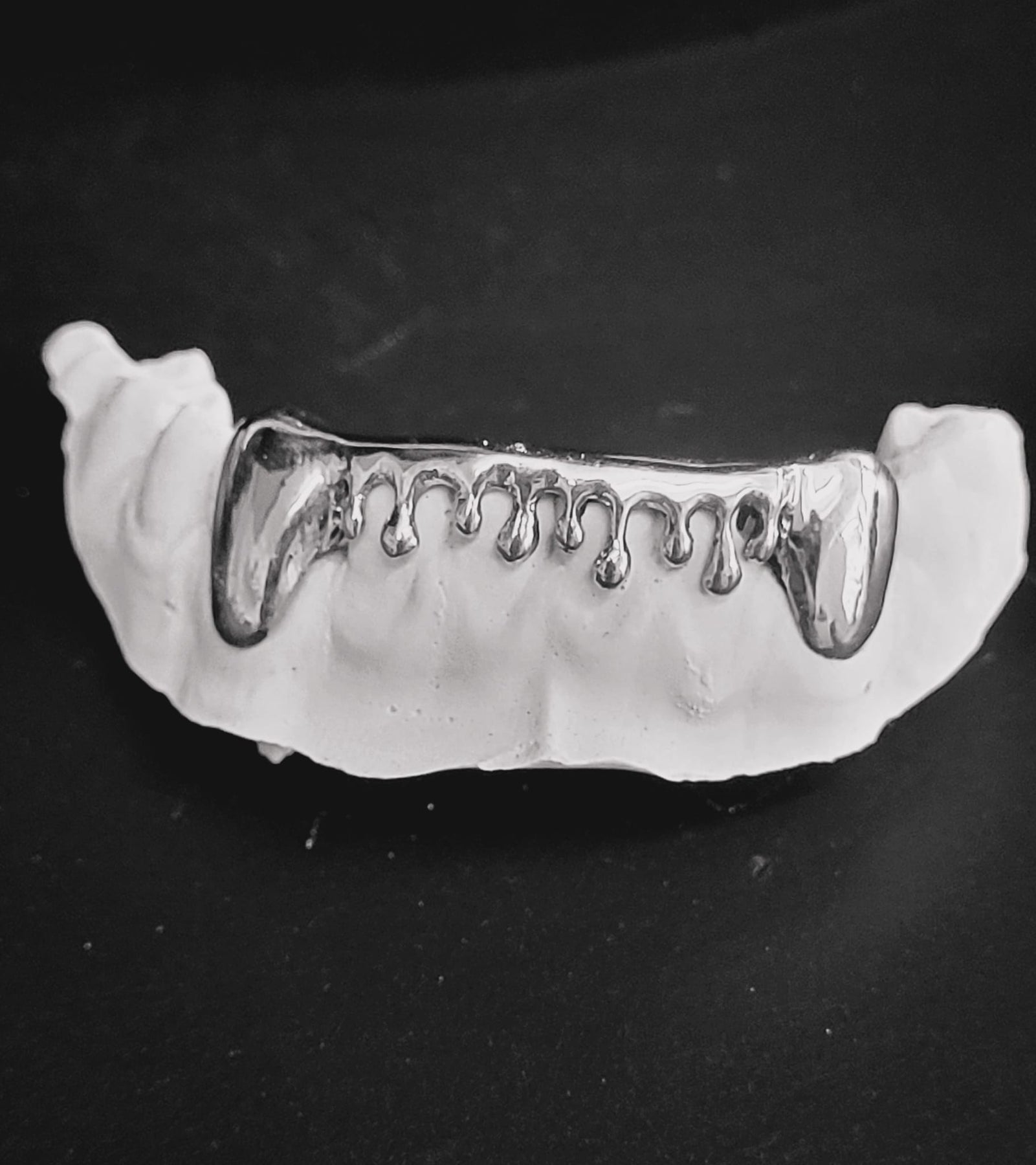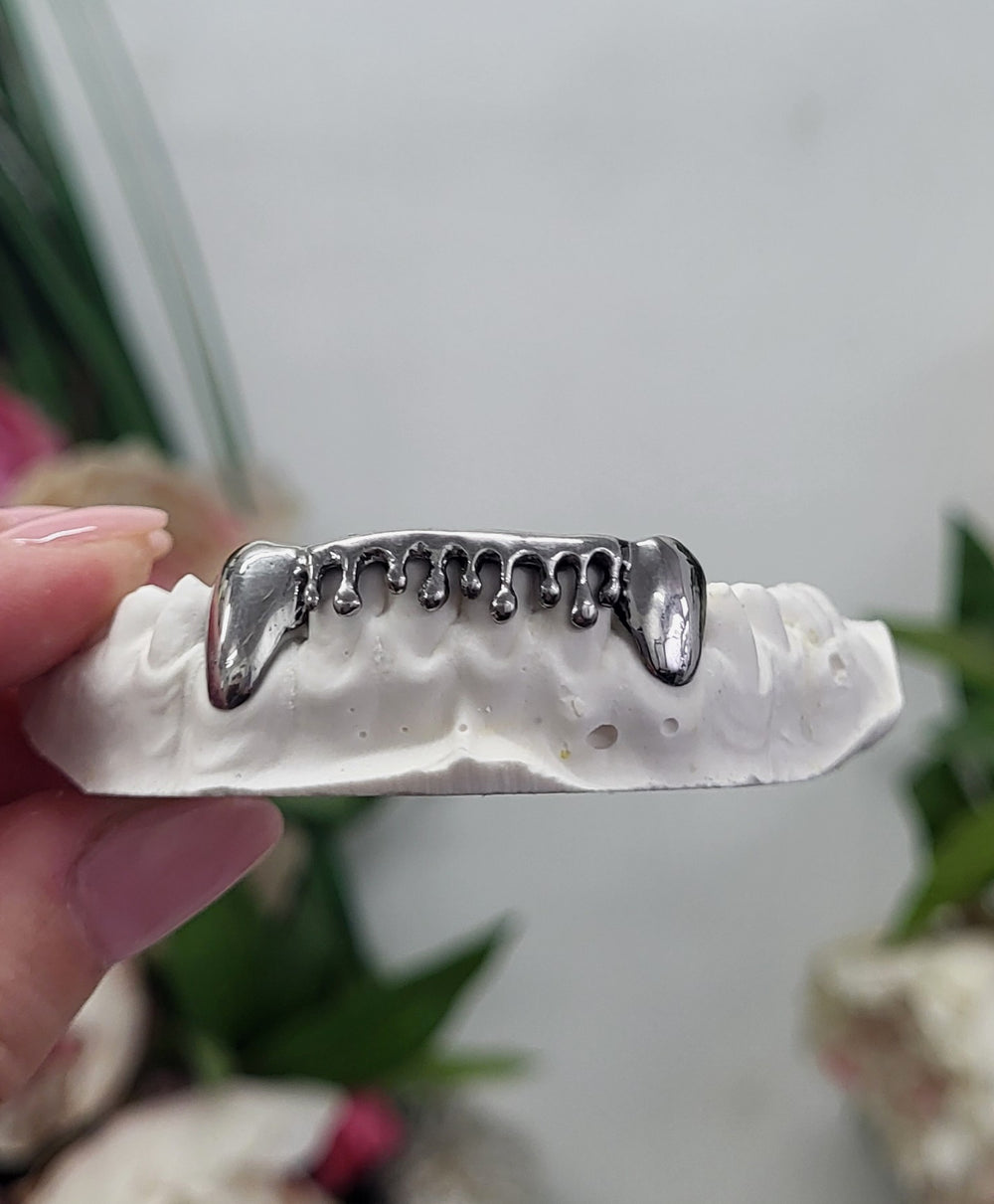 Custom made drip bar design covers six teeth and you can choose to have the design on your top or bottom 8. The design is available in silver, yellow or white dental gold, 10k, 14k and 18k solid yellow, rose and white gold (not plated). Our quality is guaranteed and comes with a standard shiny/ mirror finish. To add more caps, select the quantity and specify which teeth you want made.