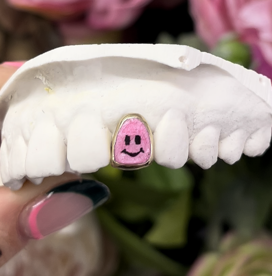 Smiley Face Single Cap covers 1 tooth and you can choose any tooth on your top or bottom 8. The design is available in silver, yellow or white dental gold, 10k, 14k and 18k solid yellow, rose and white gold (not plated). Our quality is guaranteed and comes with a standard shiny/ mirror finish. To add more caps, select the quantity and specify which teeth you want made.